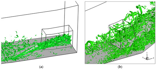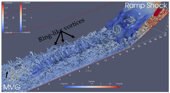 In our previous work [19,20,21], we performed numerical simulations of supersonic ramp flow with MVG control at and to understand the flow structures, especially the 3D vortex structures, behind the MVG. From our data, a dynamic vortex model was provided. The results of our LES also revealed a series of ring-like (or Ω shaped) vortices [20] behind MVGs that traveled downstream. Furthermore, the shock waves at the ramp corner were weakened substantially when interacted with the boundary layer that contained ring-like vortices at the upper bound [21].