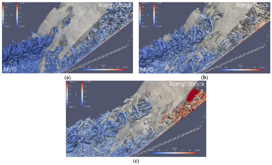 Figure 3 shows the complex vortex structure in the supersonic flow with Ma number 2.5 using the iso-surface of [26]. The ramp shock wave is also presented in Figure 2 using the iso-surfaces of pressure. The large-scale ring-like vortices (see Figure 3) found in our previous work [19,20] are generated at the boundary of a cylindrical momentum deficit shortly behind the MVG. These sturdy ring-like vortices will eventually travel downstream and interact with the strong ramp shock. It is confirmed that these ring-like vortices dominate the SWBLI in the upper boundary layer and are the mechanism of separation zone reductions [20]. Figure 4 shows the transient results for the SWBLI at the ramp corner from all three cases conducted in this study with Ma number 1.5, 2.0 and 2.5. The shock waves (colored gray) in Figure 4 are illustrated by the iso-surface of the gradient of pressure, which can better depict the multi-layer structures of the shock waves than the iso-surfaces of pressure. In all cases, iso-surfaces of gradient pressure are found to be discontinuous where the interaction between the ring-like vortices and ramp shock wave occurs. Moreover, the 3-D ramp shock waves are irregular where the upper boundary layer is located. This indicates that interaction with ring-like vortices substantially distorts and weakens the ramp shock wave.