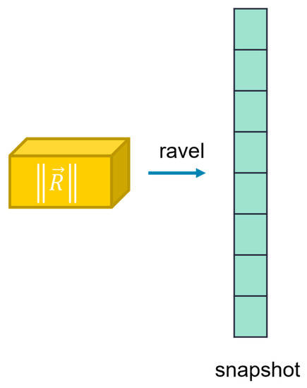 The POD analysis was based on the information obtained from all the snapshots of the two subzones. The matrix for each subzone contained 100 snapshots as its columns. Each snapshot was the flattened 1D arrays generated by the raveling of the 3D Rortex/Liutex field, as demonstrated in Figure 6.