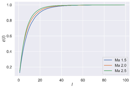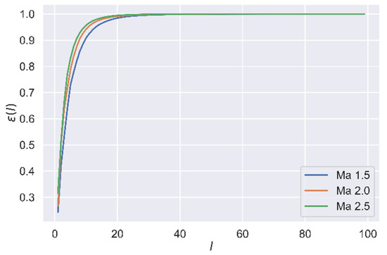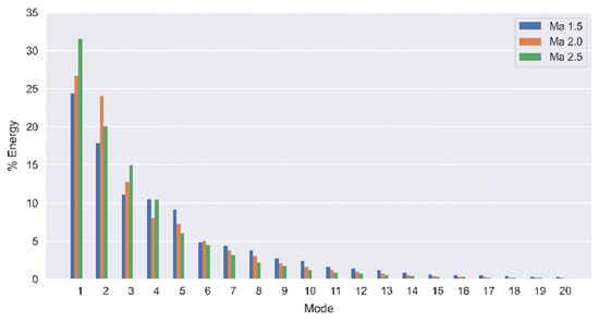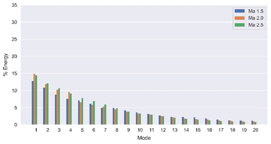 From the distribution of , we observe that the first 20 modes recover the snapshots very well. The first 20 modes contributed on average about 90.3, 92.7 and 94.7% of in the subzone behind the MVG in Ma numbers 1.5, 2.0, and 2.5, respectively. To simplify the aforementioned discussion, the analysis only focused on the first 20 modes. From Figure 7, we can see that the curve of was fuller when the Mach number was higher. This was investigated by comparing the energy percentage of the first 20 modes, provided in Figure 8. As the ordinal increased, each mode’s contribution rate to the total energy decreased. The energy increased as Mach number increased for the low ordinal modes, but the trend was reversed for the high ordinal modes.