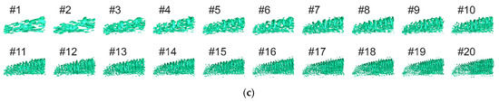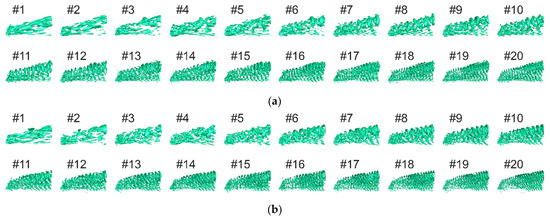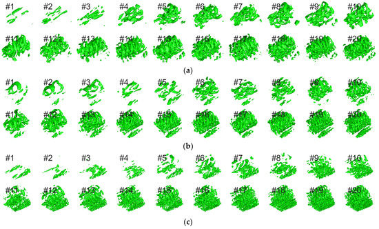 Figure 9 shows the vortical structures of the first 20 modes in the region behind the MVG with Ma 1.5, Ma 2.0, and Ma 2.5, respectively. The vortical structures are indicated by iso-surfaces of . From Figure 9, we find that the low ordinal modes had disordered structures, while the high ordinal modes had relatively regular structures, and as the Mach number varied, the vortical structures of low ordinal modes were altered drastically, but the high ordinal modes had more sturdy structures.