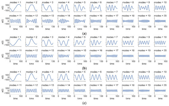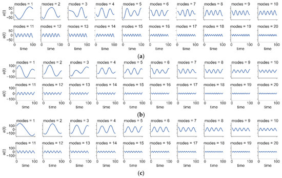 Time coefficients of the first 20 modes in the SWBLI region with (a) Ma = 1.5, (b) Ma = 2.0, (c) Ma = 2.5.