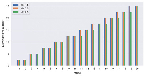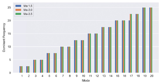 Figure 10 gives the time coefficients of the first 20 POD modes in the region behind the MVG for Ma numbers 1.5, 2.0, and 2.5, respectively. It shows that of the streamwise vortical modes had greater amplitude (138.21 on average), then decreased as the ordinal number increased, resulting in the ring-like vortical modes having smaller amplitude (77.67 on average). Oppositely, as the ordinal number increased, the frequency of increased in all cases. To investigate the frequency, we performed spectrum analysis for all signals and found the dominant frequency for each mode. The results are shown in Figure 11. In Figure 11, we observe that different Mach numbers rarely affected the dominant frequency of each mode, and the frequency of ring-like vortical modes (15.54 on average) were higher than the streamwise vortical modes (3.33 on average).