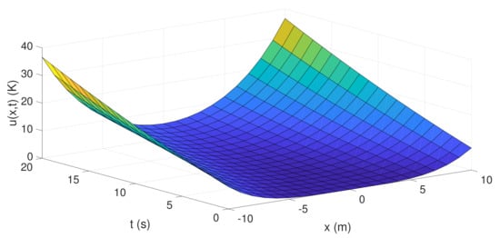 It can be verified that the scalar field corresponding to the polynomial given in Equation (11) presents a typical behavior of a function whose spatial variable contains even exponents (Figure 1). This means that the temperature increases with the spatial variable on both the positive and negative axes. Since , the temperature increases positively, while if , the temperature would increase negatively. In addition, it can be seen that the temperature increases with time on the positive side of the space axis.