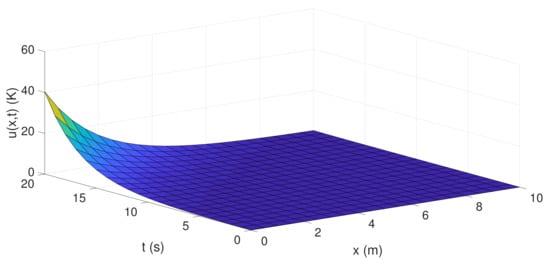 The exponential scalar field of Equation (17) is also plotted (Figure 3). It can also be seen that the temperature increases with time. In particular, when positive constants are used, the temperature increases at the left end, i.e., at ; however, this can be changed. When negative constants are used, the exponential solution becomes similar to the polynomial solution (Figure 4).