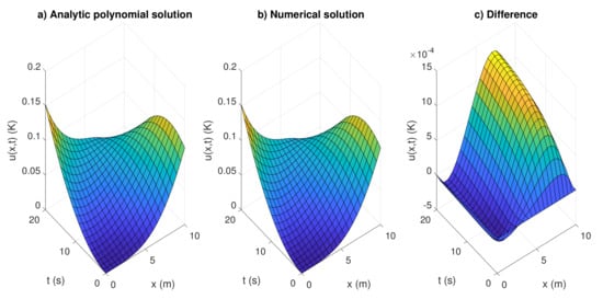 Solution. A three-dimensional heat polynomial generated with and meets the specifications given in the statement of the problem as will be seen below. Considering that the body of study is a rod, it is possible to address the problem in one-dimensional way, therefore only the spatial variable x will be used, while constants and in Equation (10) will be zero; this will favor the presentation of the graphs. The heat polynomial generated is written in Equation (23).