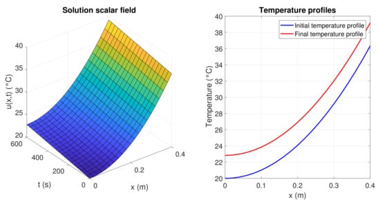 where the constants , , and , and the thermal diffusivity were used in both scalar fields. The coefficients that multiply each scalar field were chosen so that each of them was normalized over the simulated time. To make a fair comparison, the initial and boundary conditions used in the numerical solution were the same as those that resulted in the analytical solution.