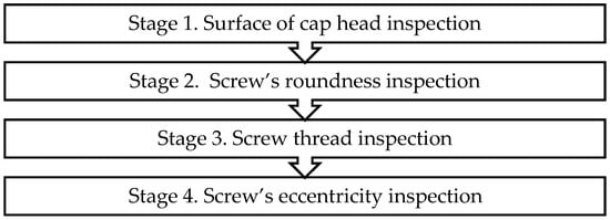 A screw product comprises a cap head and a thread. Since screws are critical equipment components, a faulty one can cause major problems, such as the equipment failing to operate normally. Hence, screw inspection is critical for its manufacturer. In this study, a screw manufacturer served as a case subject. Then, the screw inspection process was divided into four stages. The first stage was to inspect the surface of the cap head; the second was to inspect the screw’s roundness; the third was to inspect the screw thread; and the fourth was to inspect the screw eccentricity (Figure 1). An automated optical inspection (AOI) system is a visual tool that uses a camera to automatically photograph a product during its inspection. In this case, the inspector also watched the photographed image on an AOI dashboard to further detect any defective surface on the cap head. Notwithstanding, the inspector’s subjective assessment still determines whether or not the product is defective, and sometimes the inspector may incorrectly conduct a defective inspection. Therefore, this study focused on improving the cap head surface’s inspection efficiency.
