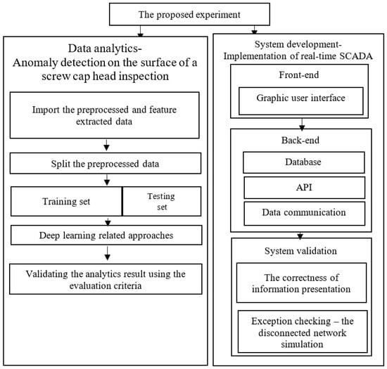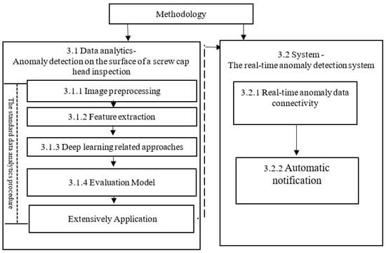 Based on this study’s aims, we designed an automatic inspection process for anomaly detection from data analytics and system design aspects (Figure 2). The first part applied data analytics in anomaly detection to stepwisely process an existing image according to the standard data analytics procedure. This study preprocessed the inspection data following the standard data analytics procedure. The standard data analytics procedure involves preprocessing, feature extraction, training, evaluation of models, and extensive application, as shown below. However, the second part is concerned with system implementation. As a result, this study proposes a real-time anomaly detection system.