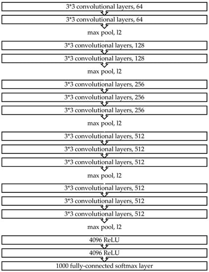 Simonyan and Zisserman [44] initially proposed the VGG network architecture. VGG-16 refers to VGG models with 16 layers. Its architecture consists of five blocks of convolutional layers that combine two previous blocks with two fully connected layers with other blocks consisting of three fully connected layers each. Convolutional layers use 3 × 3 kernels with a stride of 1 and padding of 1 to ensure that each activation map retains the same spatial dimensions as the previous layer. Subsequently, a rectified linear unit (ReLU) activation is performed immediately after each convolution, after which a max-pooling operation is used at the end of each block to reduce the spatial dimension. Two fully connected layers with 4096 ReLU-activated units are notably used before the final 1000 fully connected softmax layer (Figure 4).