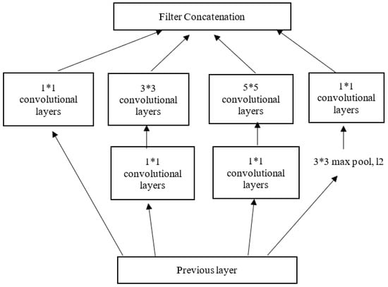 Compared with the VGG network, the Inception network comprises symmetric/asymmetric blocks of convolutional layers, such as convolutions, max pooling, average pooling, filter concatenations, dropouts, and fully connected layers. As a result, the inception network’s architecture explicitly factors in several operations [45]. First, each convolution kernel is tasked with simultaneously mapping cross-channel and spatial correlations. Then, the softmax function is used to estimate the loss (Figure 5).