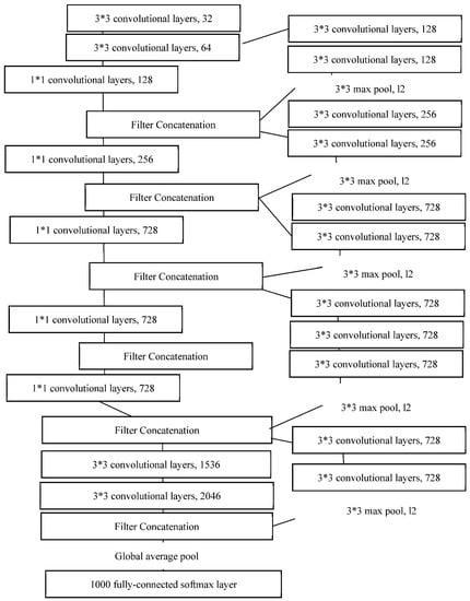 Chollet proposed the Xception architecture in 2017, based on the Inception architecture. Figure 6 demonstrates the framework of Xception [46]. Compared with Inception, the Xception model uses depth-wise separable convolutions, which include a spatial convolution performed independently for each channel and a 1 × 1 convolution across channels. Subsequently, Xception separately maps the spatial correlations for each output channel from the cross-channel correlation across a two- and one-dimensional space.