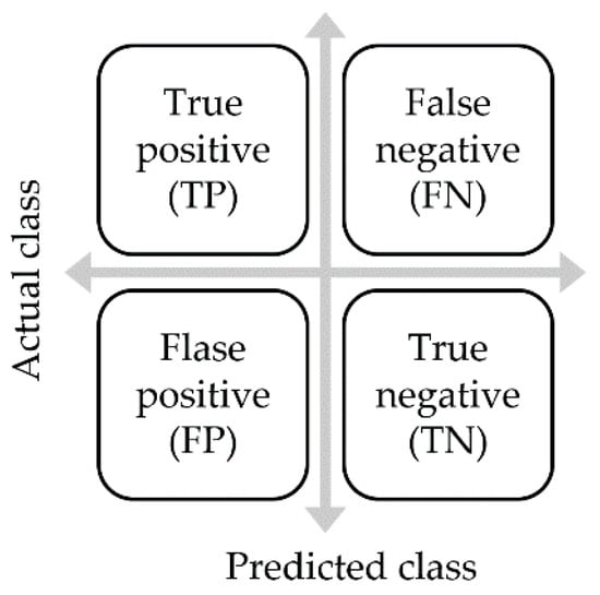 A confusion matrix is a two-dimensional matrix used to describe the performance of a classification model (Figure 7). The evaluation item is based on a two-dimensional prediction and actual result, which can be classified into four types: false negatives (FN), true negatives (TN), false positives (FP), and true positives (TP). Subsequently, FN, TN, FP, and TP are used to estimate the accuracy, precision, recall rate, and F1 score. Each criterion is discussed in detail below.