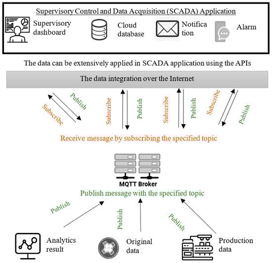 This study proposed an approach for users to manage anomaly detection. Therefore, the MQTT protocol and API were applied to convey the data to a human. Figure 8 illustrates the architecture of the proposed system. First, we observed that the MQTT transfer of the real-time message, based on a specified topic, enabled the real-time data connectivity network. Then, the API receives the message and report generation, notification, and alarm automatically, producing results on the SCADA dashboard. Consequently, the proposed system eases the user interaction with the system’s configuration and data connectivity.