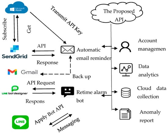 This study used a representational state transfer API (RESTful API) to develop a user notification mechanism. The RESTful API is based on the RESTful architecture. Specifically, RESTful is a communication architecture that is commonly used in the development of web services (WS). The API here is the middleware between the user and the service. Accordingly, the RESTful API can be used to access the WS by sending a hypertext transfer protocol (HTTP) request. Notably, RESTful APIs use request types to access the application, which includes “GET”, “POST”, “DELETE”, and “PUT”. These request types refer to retrieving, passing, deleting, and updating instructions for data applications. Specifically, while the “GET”-type request is applied to retrieve resources, the “POST”-type request is applied to pass and create resources. Moreover, while the “DELETE”-type request is used to delete information, the “PUT”-type request is applied to pass information, change the state, or update information. Based on this background, we built an API server and created a query argument and response content. Investigations revealed that while the proposed APIs could be managed using Swagger, the analytics module provided the APIs, allowing users to access the trained model directly through HTTP. We also observed that since this study consistently uses the JSON format as the API response format, it could be applied extensively to WS or mobile applications. Additionally, in this study, the received argument while calling API and the response result of API must encode and decode using message-digest algorithm 5 (MD5) separately. Hence, we protected the API connectivity and communicating content using MD5 encryption and decryption, and as a result, this study proposed a report API notification (Figure 10). Therefore, a user can configure the threshold value of an alarm and know if the value exceeds the threshold value. After the API receives the real-time MQTT message, it automatically generates an anomaly report and sends the alarm notification via email and LINE Bot.