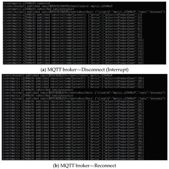 The trained model, deployable using various deep learning approaches, was deployed as a RESTful API that can be used for anomaly detection in edge- or cloud-based analytics. After conducting an anomalous inspection, the supervisory control was fully automated. Subsequently, the real-time SCADA dashboard displayed the current number of screws with defected surfaces, after which the supervisor designed a production plan according to the real-time result to avoid delayed shipment. This study used MQTT and a broker server to develop a real-time cyber network for messaging and generating real-time information for the SCADA and notification applications. We observed that while MQTT technologies played an important role in data connectivity, data consistency was important for communication in the industrial internet of things environment. Subsequently, this study validated the data consistency by stopping and restarting the broker server to simulate the network’s disconnect and reconnect status. Figure 13 shows that the real-time defective product counter was correctly uploaded to the cloud while the MQTT client was reconnected to the MQTT broker. Investigations also revealed that the data during the disconnected status successfully re-messaged the cloud MQTT broker and could, thus, consistently communicate between the client sides. The last value of the defective product counter was 21, after which the network was disconnected. Further, a new value, 22, was uploaded when the network reconnected (Figure 13).