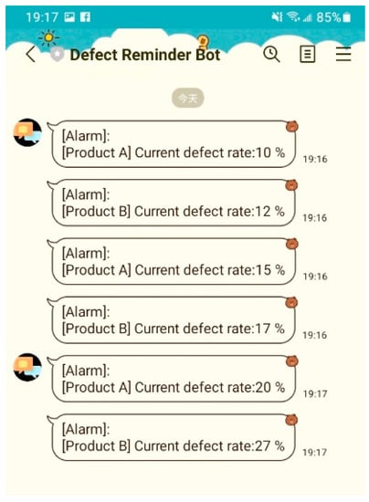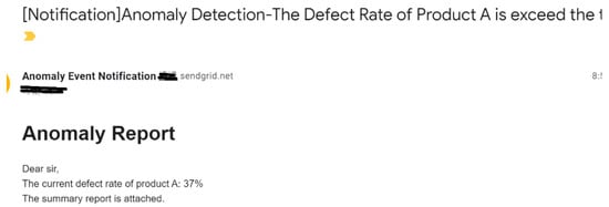 Also, in this study, the proposed system provided a flexible format for the user to design an MQTT topic and anomaly detection message. The real-time yield could be calculated and displayed on the dashboard while SCADA receives the real-time message published from the anomaly event (Figure 14). Additionally, this study proposed APIs to automatically generate the anomaly report and send it to the supervisor by email. Interestingly, the third-party RESTful APIs cooperated with the MQTT protocol to provide an auto-notification using the chat tool, Bot. Then, the supervisor could set the alarm or notify the threshold. Although the value of the defective product was over the threshold, investigations showed that they could receive anomaly reports through emails, including an alarm message from the chat Bot (Figure 15 and Figure 16). Moreover, this study proposed or used APIs based on the RESTful API framework. The RESTful APIs have different calling types, and this study used the “POST”-type to transmit information and create a resource. In addition, we proposed managing APIs through Swagger. In this study, the anomaly detection APIs enabled users to directly access the trained model via HTTP and provided an efficient way for the cloud system to access the function. A system can send an API request through the HTTP media type and respond to information in the typical API design. Similarly, this study used the JSON format as its MQTT and API protocol response formats, which is widely used in web and mobile applications.