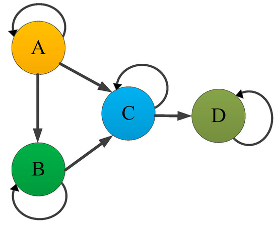 Based on the comprehensive consideration of Type I failure dependence and Type II failure dependence, a multi-component failure-dependence model has been analyzed in detail by the authors of [43]. This paper mainly relies on the analysis results of [43] to establish the model. Figure 1 shows the failure influence path of a four-component system.