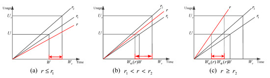 where “” represents the rounding down function; represents the time required for imperfect preventive maintenance; indicates the end time of the EW period for the utilization rate ; and indicates the start time of the EW period for the utilization rate . The values of and are decided by the value of , as shown in Figure 3 and Figure 4.