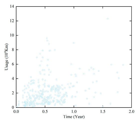 Since the gearbox has a low rate of failure within the duration of a basic warranty, only the post-failure minimum maintenance can be considered. During the EW period, the gearbox has been in service for a period of time, and the failure rate increases significantly. Based on the minimum maintenance after failure, it is necessary to conduct imperfect preventive maintenance. Through field investigation, we collected the failure history data of the CRH6-200 gearbox, which is widely used in EMU systems in China. The data included the time to first failure (year) and the kilometer at the failure time for the bearing. We collected a total of 1000 groups of data and plotted a scatter diagram, as shown in Figure 6.