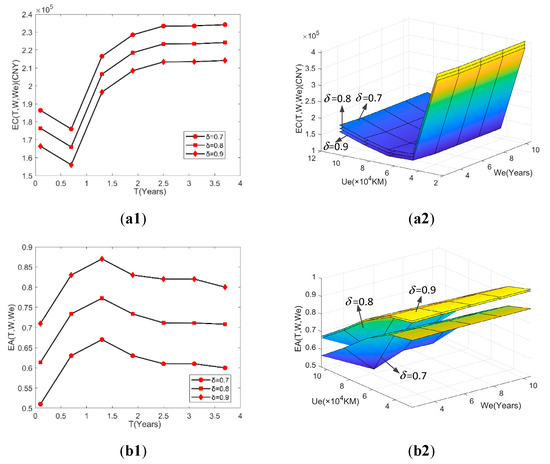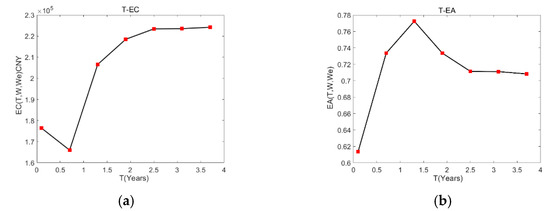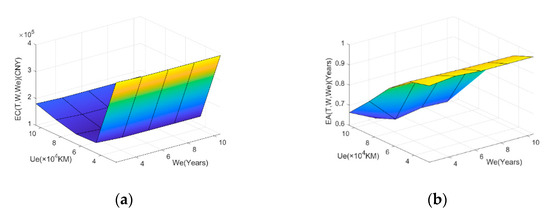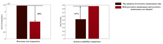 It can be seen from Figure 16 that the larger was, the lower the cost of the gearbox EW cost, and the higher the availability. This was mostly due to the fact that larger values corresponded with better effects of imperfect preventive maintenance on reducing the system failure rate and a lower expected minimum maintenance times of the gear. This increased the availability of the gearbox system and decreased the warranty cost. The imperfect preventive maintenance improvement factor generally reflects the maintenance level of the manufacturer. Thus, the manufacturer can pursue a higher improvement coefficient for preventive (imperfect) maintenance by improving the quality of maintenance workers, improving the maintenance technology, and strengthening technological innovation.