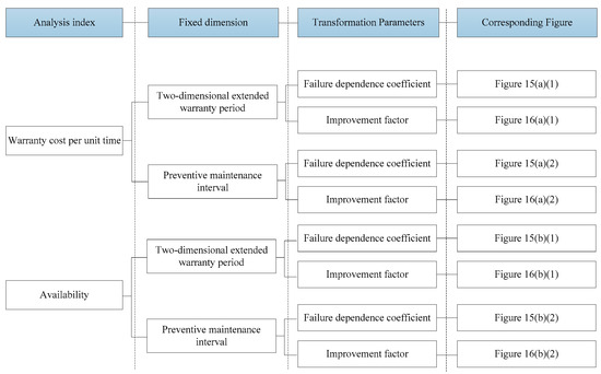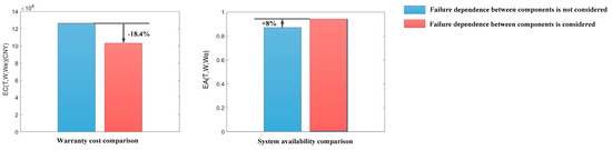 Availability refers to the probability that a multi-component system is in a usable state when it starts to perform tasks at any random time. Availability is one of the important parameters that affect users. In the field of maintenance decision making, the availability of equipment has been extensively studied. Some studies have only considered the impact of availability on maintenance decision making. For example, Yang [32] took the maximum average availability of a system as the decision-making goal and obtained the optimal preventive maintenance interval. Henry et al. [33] compared the availability of a power generation system under reliability-centered maintenance (RCM), risk-based maintenance (RBM), condition-based maintenance (CBM), and a combination of the three maintenance strategies. However, these studies did not consider the impact of the maintenance cost on decision making. Meanwhile, it has been found that some studies have paid attention to both the availability and the maintenance cost. For example, Qiu [34] considered both the maintenance cost and the system availability, and studied the optimal failure detection and imperfect maintenance strategy of a remote power supply system; Ahn [35] studied the optimal preventive maintenance interval for minimizing the maintenance cost on the premise of ensuring the availability of an engineering system. Research considering both the warranty cost and the availability in two-dimensional warranty decision making has been conducted by the authors of [36,37,38]. However, there are few studies on 2D warranties that consider the warranty cost and the availability with multi-component failure dependence.