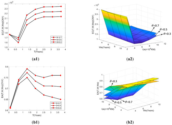 Sensitivity analysis of . (a1,a2) Warranty cost as a function when changes. (b1,b2) Availability as a function when changes.