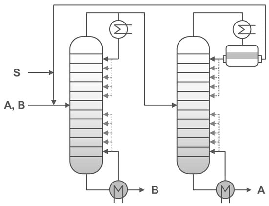 - Setting up and solving a mass-balance-based model of the integrated overall process assuming that both columns produce pure product streams of components A and B, respectively. Furthermore, the top vapor stream in the heterogeneous column is assumed to have the composition of the low boiling heterogeneous azeotrope regardless of whether it is a ternary (topology (a)) or a binary azeotrope (topology (b) or (c)). The decanter completely separates the two phases and the solvent-lean phase is considered as distillate product, which is recycled to the simple distillation column. As an objective function, the fresh solvent stream is minimized by varying the amount of the product streams as well as the composition of the product stream of the homogeneous distillation column. This step is similar to the application of the ∞/∞-approach described by Ryll et al. [38] and provides estimates for the top product compositions and the recycle stream (cf. Figure 3c).
