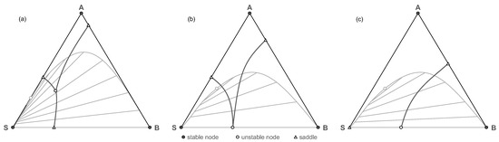 While the phase equilibrium information of chemical systems can be more or less complex, the information about the number and type of singular points allows for a characterization of the individual mixture and the analysis of viable products, distillation regions, and potentially even process synthesis [5,34,35]. Due to the potential graphical analysis of residue curve maps and distillation line maps, especially ternary mixtures have been heavily investigated. Kiva et al. [4] and Kiva and Krolikowski [36] provide detailed analysis of ternary mixtures and the suitability of azeotropic distillation processes for separating certain mixture topologies. For the application of heteroazeotropic distillation, the general topology of a ternary mixture is composed of the azeotropic binary subsystem, which is to be separated using the additional solvent that introduces a minimum-boiling heterogeneous azeotrope. Kiva et al. [4] indicate that primarily three topologies cover the majority of real mixtures. These topologies are illustrated in Figure 2.