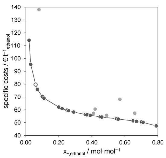 Specific costs of ethanol for variable feed compositions. The white circle indicates the feed composition from Section 3.1.1 and Section 3.1.2.