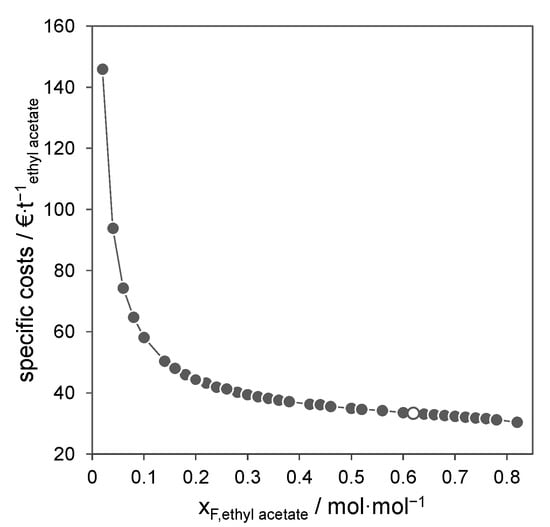 Specific costs of ethyl acetate for variable feed compositions. The white circle indicates the feed composition from Section 3.2.1.