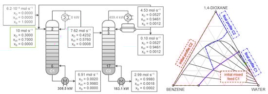 Optimal process design for the separation of 1,4-dioxane and water using benzene as a solvent in a two-column heteroazeotropic distillation setup (left), including the initial and final liquid composition profiles of both columns in the corresponding Gibbs diagram (right). The initial composition profiles of columns C1 and C2 are plotted as red cross and dashed line, respectively, while the final composition profiles of both columns are plotted as blue dot-dashed lines. The feed composition is indicated by a green square and all singular points as well as the liquid-liquid critical point are marked as black circles.