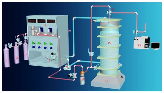 The schematic diagram of the apparatus is shown in Figure 1. The gases were generated and controlled by gas cylinders (1–3), mixing tank, and mass flowmeter (4), (25 °C, 101.325 kP), and the total flow was 2 L·min−1. The volume fractions of N2, O2, and CO2 were 89.96%, 10%, and 0.04%. Chlorobenzene (8) was placed in a water bath at 35° C, and the total concentration of chlorobenzene and xylene was no more than 800 mg·m−3 before mixing. During the 3–4 weeks of the experiment, a fluctuation of ±4% was detected when a certain concentration of chlorobenzene was set. The four layers of the cylindrical BTF (10) were made of a polymethylmethacrylate (PMMA) column (total volume/height/diameter: 4 L/0.8 m/79.8 mm) (10), and a degassed desiccator was set on top of the BTF to eliminate the effect of water vapors on the gas flow rate. Some raschig-ring fillers (Φ10 × 10, about 2400 m2·m−3 in total specific surface area) were filled up to half of the reactor volume, and were regularly packed in the reactor. A tank (11) for liquid storage was set up at the bottom of the BTF. The inlet and outlet of liquid flow were controlled by a circulating pump (6) and the circulating flow rate was maintained at 5.17 m3·m−2·h−1 at room temperature. Gas detection was mainly accomplished online by gas chromatography (12).