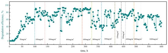 The effect of inlet concentration of chlorobenzene on the operation of the BTF is shown in Figure 4. When the inlet concentration of chlorobenzene was raised from 50 mg·m−3 to 300 mg·m−3, the available carbon source for microorganisms gradually increased, so the degradation of chlorobenzene was raised from 85% to 88%. It remained at about 78% when the inlet concentration of chlorobenzene was between 400–700 mg·m−3. Moreover, the degradation efficiency was maintained at 60% at 1500 mg·m−3. It can be deduced that the massive inlet concentration of chlorobenzene was toxic toward the activity of the bacteria, leading to a gradual decline in degradation efficiency. Padhi et al. also found a negative correlation between VOC concentration and degradation efficiency when treating organic waste gas with BTF []. This indicates that the inhibition of effective biomass and gas–liquid mass transfer occurred in the system under a high inlet loading of chlorobenzene, so the capacity of substrate conversion per volume of biomass was close to the maximum. If the loading of chlorobenzene further increased, the biological activity in the system was inhibited, and then the substrate conversion capacity also reduced.