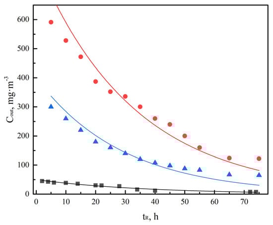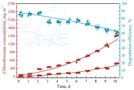 As is shown in Figure 5, the removal loading did not increase noticeably when the EBRT exceeded 80 s. The relationship between outlet concentration of chlorobenzene by biodegradation and time of long-term run under different inlet concentrations of chlorobenzene is shown in Figure 9, and it can be expressed as Formula (15).