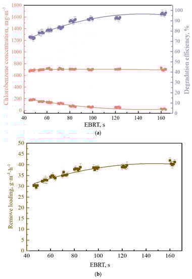The EBRT of simulated waste gas in the BTF has a great influence on the performance of chlorobenzene degradation [,,]. The experiment analyzed the influence of different EBRT on the chlorobenzene degradation of the BTF; results are shown in Figure 5. With the EBRT increasing, the degradation of chlorobenzene showed a trend of increment. The maximum degradation reached 96% when the EBRT was 160 s. It also can be seen from Figure 5 that the removal loading improved with the increase in the EBRT. The removal loading reached 38 g·m−3·h−1 when the EBRT was 80 s. After the EBRT exceeded 80 s, there was no obvious impact on the removal loading, which remained at 40 g·m−3·h−1. This was due to the limitation of effective biomass and gas–liquid mass transfer in the system, and the capacity of substrate conversion per volume of biomass was close to the maximum. Li et al. found that the removal loading reached 35 g·m−3·h−1 with an inlet chlorobenzene concentration of 1670 mg·m−3 and an EBRT of 90 s, which was, however, lower than our result []. If the inlet concentration of chlorobenzene or the EBRT further increased, the microbial activity might be inhibited in the system. The degradation effect of chlorobenzene declined [,]. Therefore, an EBRT of no more than 80 s was determined to be sufficient in this system.