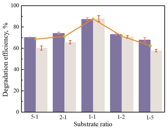 BTFs often deal with multi-component organic gas, and different organic compounds often inhibit each other in the biodegradation process. Therefore, it is of great significance to study the interaction between different organic compounds [,,]. Figure 6 shows the degradation efficiencies of xylene and chlorobenzene at different concentration ratios. The degradation efficiencies of chlorobenzene were observed by changing different concentration ratios of chlorobenzene and xylene in organic waste gas. When the concentration ratio of chlorobenzene and xylene was 1:1, the degradation efficiencies of chlorobenzene reached a maximum of 87.6%. The degradation efficiency is 14.1% higher than that of 14.1% result achieved with an inlet chlorobenzene concentration of 800 mg·m−3 in Figure 4. However, when the concentration ratio of chlorobenzene and xylene was 1:5 or 5:1, the average degradation efficiencies declined to 62.26% and 68.52%, respectively. Therefore, regardless of which organic compound had a higher concentration, the overall degradation efficiency was reduced, which may have been caused by the influence of the degradation pathway of chlorine and methyl groups on microorganism activities. Above all, the chlorobenzene and xylene both had a better removal efficiency under the ratio of 1:1.