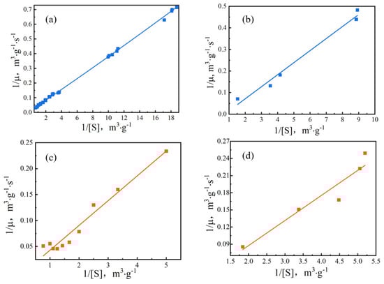 where Km (g·m−3) is the apparent semi-saturation constant, [S] (g·m−3), which represents the ratio of substrate concentration in the liquid/solid phase and that in the gas phase. μ (g·m−3·s−1) is the reduction rate, and μmax (g·m−3·s−1) is the maximum apparent generation rate. Equation (4) expresses the apparent kinetic parameters of the chlorobenzene reduction.