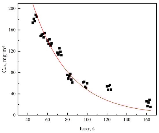 The relationship between outlet concentration of chlorobenzene and EBRT. (Liquid rate = 5.17 m3·m−2·h−1, pH = 6.5–7.0, oxygen concentration = 10%).