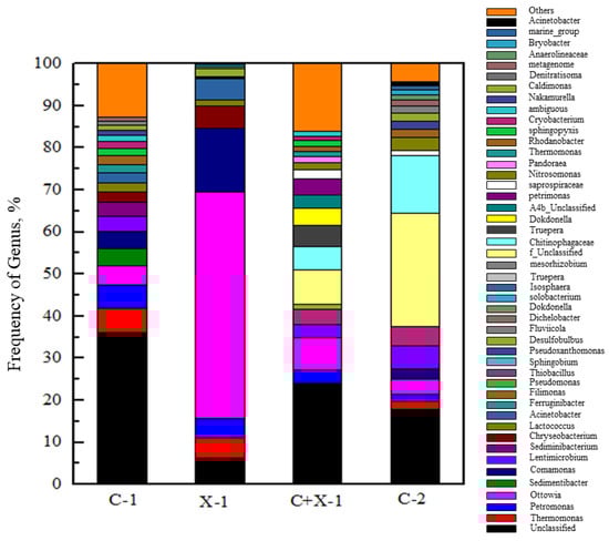 Figure 10 shows the distribution of the microbial communities of the four samples at genus level. It can be seen that the dominant flora was Thermomonas and Petrimona in the sample C-1; Ottowia, Comamonas, and Chryseobacterium in the sample C-2; Ottowia in the sample C+X, and Lentimicrobium in the sample C-2. Thermomonas and Petrimona accounted for 5.74% and 5.51% of the total amount of bacteria with chlorobenzene as the sole carbon source. Grabowski et al. [] found that Petrimonas had strong ability to degrade complex organic compounds. Zhu et al. [] found that Thermomonas could degrade aromatic compounds effectively under anaerobic condition. Ottowia, Comamonas, and Chryseobacterium accounted for 74.27% in total, and Ottowia accounted for 54.02% with xylene as the sole carbon source. Dafale et al. [] observed that Ottowia was an aroma-degrading bacteria accumulated in UASB and SBR bioreactors. Compared with xylene as the sole carbon source, microorganisms in the system were much more abundant with mixed carbon sources. Under acid conditions with chlorobenzene as the sole carbon source, Lentimicrobium, which mainly treats high concentrations of organic compounds [], accounted for 5.63%, while unnamed microorganisms accounted for a relatively high proportion of more than 50%. In general, the fluctuation of the operating conditions had a great impact on the microbial communities. Above all, the dominant bacteria in the system degrading chlorobenzene were Thermomonas, Petrimona, and Comamona, while the dominant bacteria degrading xylene was Ottowia.