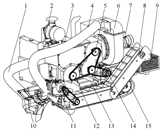 Structure of the positive and negative synergistic airflow-type jujube fruit harvester (P-N JH). 1. negative pressure airflow pipe; 2. diesel engine power generation system; 3. positive pressure airflow pipe; 4. control cabinet; 5. inertial airflow type cleaning system; 6. air distribution and regulation device; 7. centrifugal fan; 8. jujube fruit conveying device; 9. turnover basket; 10. negative synergistic airflow pick up device; 11. gear motor; 12. jujube guide slot; 13. frame; 14. transmission mechanism; 15. caterpillar walking chassis.