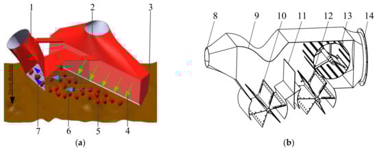 The key device of the positive and negative synergistic airflow-type jujube fruit harvester (P-N JH): (a) working principle of pneumatic pickup, and (b) operation principle diagram of the inertial airflow cleaning system. 1. negative pressure airflow mouthpiece; 2. positive pressure mouth; 3. ground; 4. positive pressure airflow direction; 5. jujube fruit; 6. jujube fruit movement direction; 7. negative pressure airflow direction; 8. materials inlet; 9. diversion surface; 10. jujube fruit closed-air aspirator; 11. regulating plate; 12. impurities closed-air aspirator; 13. roller screen; 14. materials outlet.