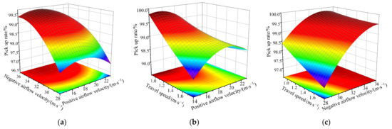 Response surfaces graph of the interaction factors for the pickup rate: (a) influence of interaction factors between the positive airflow velocity and the negative airflow velocity, (b) influence of interaction factors between the positive airflow velocity and the travel speed, and (c) influence of interaction factors between the negative airflow velocity and the travel speed.