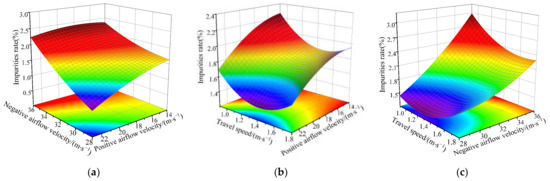 Figure 4b shows the response surfaces graph of the interaction influence between positive pressure airflow velocity and travel speed on the impurities rate, as the negative pressure airflow velocity is placed in the middle level (32.0 m∙s−1). With the increase in the travel speed, the impurities rate first decreases and then increases slowly, which is the same as the research result of Zhang et al. [13]. The lowest impurities rate is about 1.4%, as the travel speed and the positive pressure airflow velocity are 1.4 m∙s−1 and 23 m∙s−1.