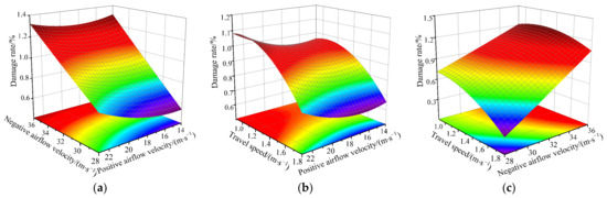 Response surfaces graph of the interaction factors for the damage rate: (a) influence of interaction factors between the positive airflow velocity and the negative airflow velocity, (b) influence of interaction factors between the positive airflow velocity and the travel speed, and (c) influence of interaction factors between the negative airflow velocity and the travel speed.