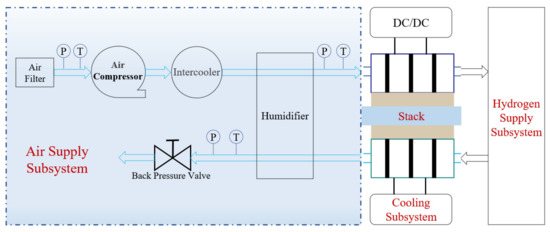 The PEMFC system architecture adopted in this paper is shown in Figure 1. This paper mainly studies the control optimization of the air supply subsystem. Therefore, the air supply subsystem and PEMFC stack are described in detail in Figure 1.