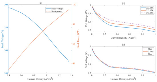 Figure 2b,c show the influence of stack temperature and cathode pressure on the output characteristic curve of a PEMFC single cell. In Figure 2b, with the increase in stack temperature, the reaction in the stack intensifies, and the output voltage of a single cell increases accordingly. In Figure 2c, with the increase in cathode pressure, the air supply in the reactor is timely, and the output voltage of a single cell is also increased accordingly. However, considering the stack materials, the stack internal sealing performance and the power consumption of the accessory system, the stack temperature and cathode pressure cannot be increased without limit. The above analysis proves the rationality and effectiveness of the established PEMFC model.