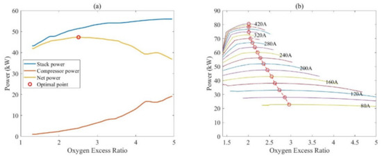Under different load current requests, the oxygen excess ratio is changed by controlling the compressor driving motor voltage, and the curve of the change of PEMFC net power with oxygen excess ratio can be obtained, and then find the optimal oxygen excess ratio under the fixed current request, as shown in Figure 3b. The load current is controlled to change from 80 A to 420 A (see Figure 3b), the step is 20 A, and the oxygen excess ratio is controlled to change between 1.5 and 3.5. The variation curve of the PEMFC net power with the oxygen excess ratio under each fixed current request is obtained. Under different load current requests, there exists an optimal oxygen excess ratio, which maximizes the PEMFC net power. The optimal oxygen excess ratio parameters of the PEMFC system are shown in Table 2.