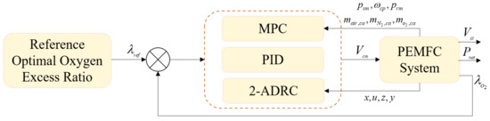 Aiming at the optimal control of the PEMFC air supply subsystem, researchers have proposed the control methods of OER [18]. Due to its simple structure and low cost, PID (Proportion Integration Differentiation) controller has become a more classical OER control algorithm. Zhao et al. proposed a fractional order PID controller based on a nonlinear observer to adjust the OER to the expected value. However, the PID control algorithm relies on engineering experience and lacks control accuracy [19]. Tang, X. et al. [20] reported an improved algorithm, coupled fuzzy logic and PID controller, and proposed an AFPID (Adaptive Fuzzy PID) control algorithm. However, the rules of fuzzy control are limited, and the control effect of OER still needs to be improved. MPC (Model Predictive Control) algorithm is also used in the optimal control of OER [21,22], but the MPC control model obtained by identifying and simplifying the controlled system is often difficult to obtain the optimal model accuracy and control effect.