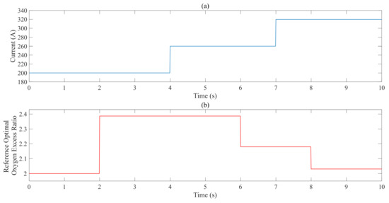 The simulation condition: (a) Load current change condition; (b) Reference optimal oxygen excess ratio.
